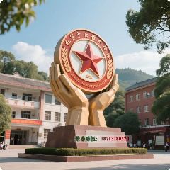 双手托起校徽金属雕塑,学校不锈钢